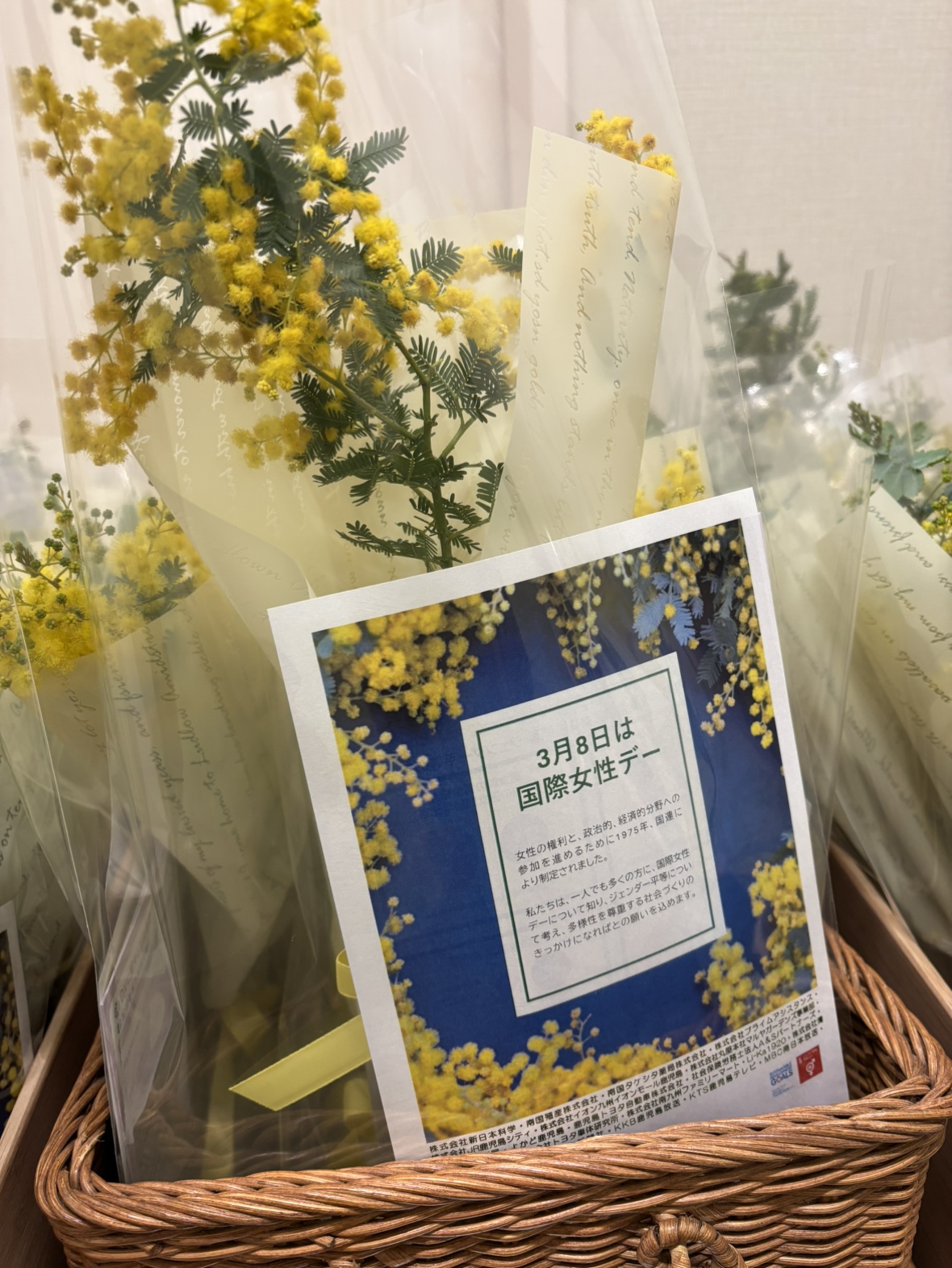 南国タケシタ薬局では今年もシンボルフラワーのミモザのミニブーケを配布しました。
